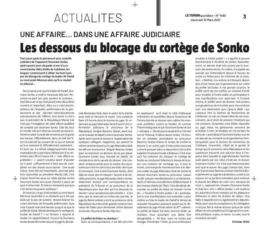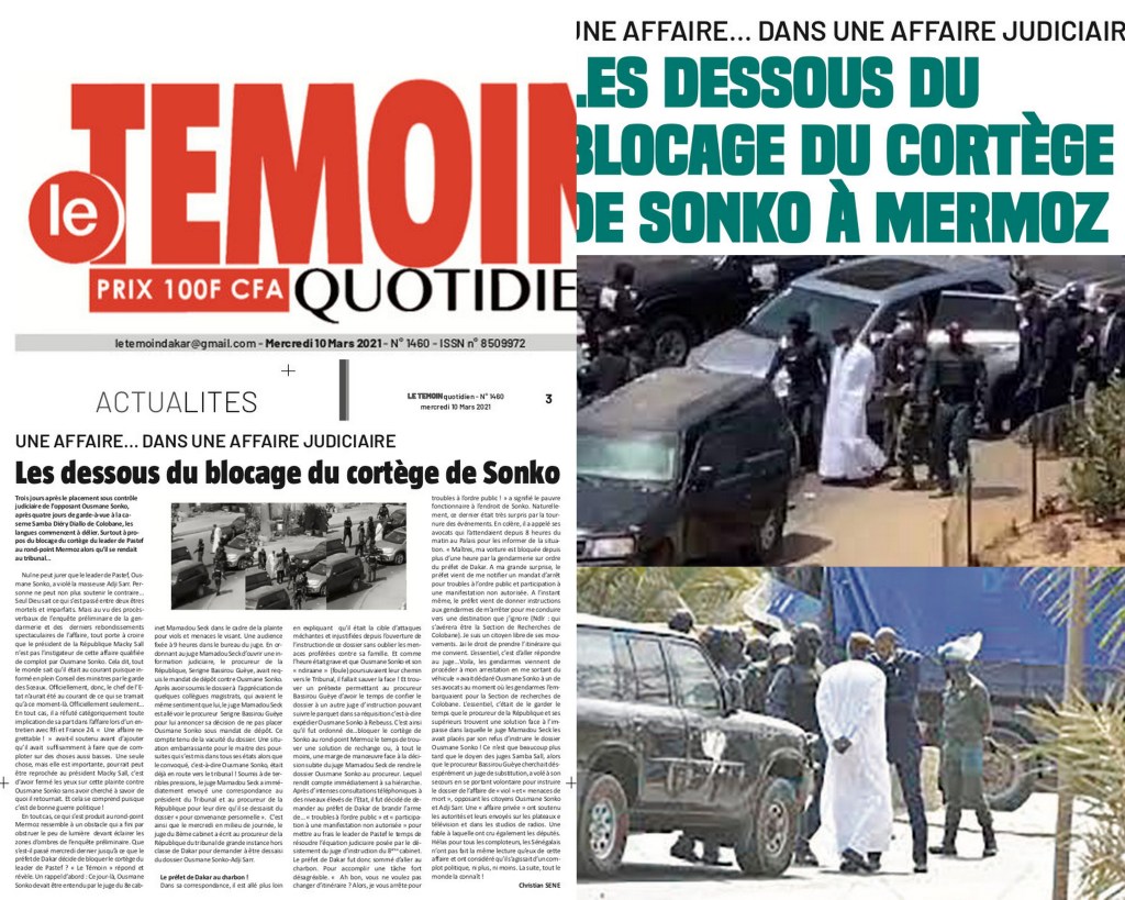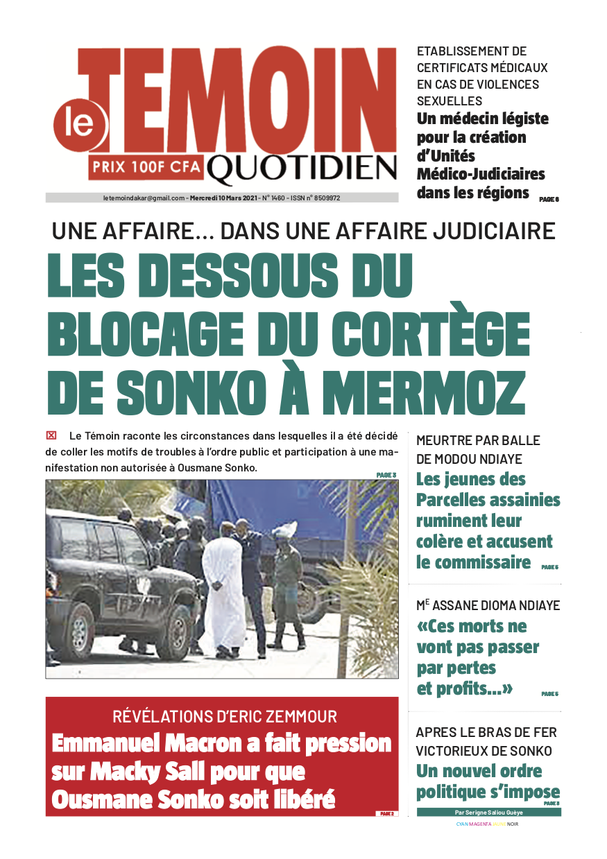 En tout cas, ce qui s’est produit au rondpoint Mermoz ressemble à un obstacle qui a fini par obstruer le peu de lumière devant éclairer les zones d’ombres de l’enquête préliminaire. Que s’est-il passé mercredi dernier jusqu’à ce que le préfet de Dakar décide de bloquer le cortège du leader de Pastef ? « Le Témoin » répond et révèle. Un rappel d’abord : Ce jour-là̀, Ousmane Sonko devait être entendu par le juge du 8e cabinet Mamadou Seck dans le cadre de la plainte pour viols et menaces le visant. Une audience fixée à 9 heures dans le bureau du juge. En ordonnant au juge Mamadou Seck d’ouvrir une in formation judiciaire, le procureur de la République, Serigne Bassirou Guèye, avait requis le mandat de dépôt contre Ousmane Sonko. Après avoir soumis le dossier à l’appréciation de quelques collègues magistrats, qui avaient le même sentiment que lui, le juge Mamadou Seck est allé́ voir le procureur Serigne Bassirou Guèye pour lui annoncer sa décision de ne pas placer Ousmane Sonko sous mandat de dépôt. Ce compte tenu de la vacuité́ du dossier. Une situation embarrassante pour le maitre des poursuites qui s’est mis dans tous ses états alors que le convoqué, c’est-à-dire Ousmane Sonko, était déjà̀ en route vers le tribunal ! Soumis à de terribles pressions, le juge Mamadou Seck a immédiatement envoyé́ une correspondance au président du Tribunal et au procureur de la République pour leur dire qu’il se dessaisit du dossier « pour convenance personnelle ». C’est ainsi que le mercredi en milieu de journée, le juge du 8ème cabinet a écrit au procureur de la République du tribunal de grande instance hors classe de Dakar pour demander à être dessaisi du dossier Ousmane SonkoAdji Sarr.