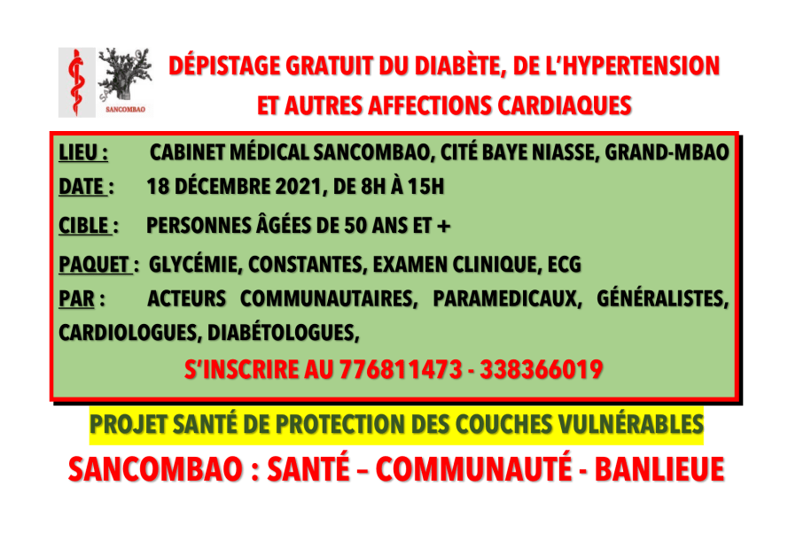 Le cabinet médical SANCOMBAO organise, le 18 décembre 2021, dans le cadre de ses activités sociales et d’un projet de protection des couches vulnérables, une journée de lutte contre les maladies non transmissibles (hypertension artérielle, maladies cardiaques, diabète, …).