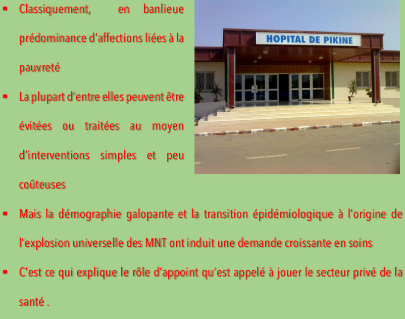 Classiquement, les problématiques sanitaires au niveau de la banlieue étaient dominées par des affections liées à la pauvreté (transmissibles, carentielles, en rapport avec la santé reproductive), que le système public de santé a toujourd tenté, de maîtriser, tant bien que mal, grâce à la stratégie des soins de santé primaires.