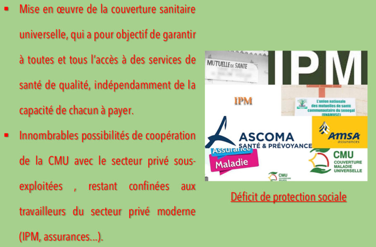 Depuis quelques années, on assiste à la mise en œuvre de la couverture sanitaire universelle, qui a pour objectif de garantir à toutes et tous l’accès à des services de santé de qualité, indépendamment de la capacité de chacun à payer. Pour le moment, les innombrables possibilités de coopération de la CMU avec le secteur privé demeurent sous-exploitées , restant confinées aux travailleurs du secteur privé moderne (IPM, assurances…).
