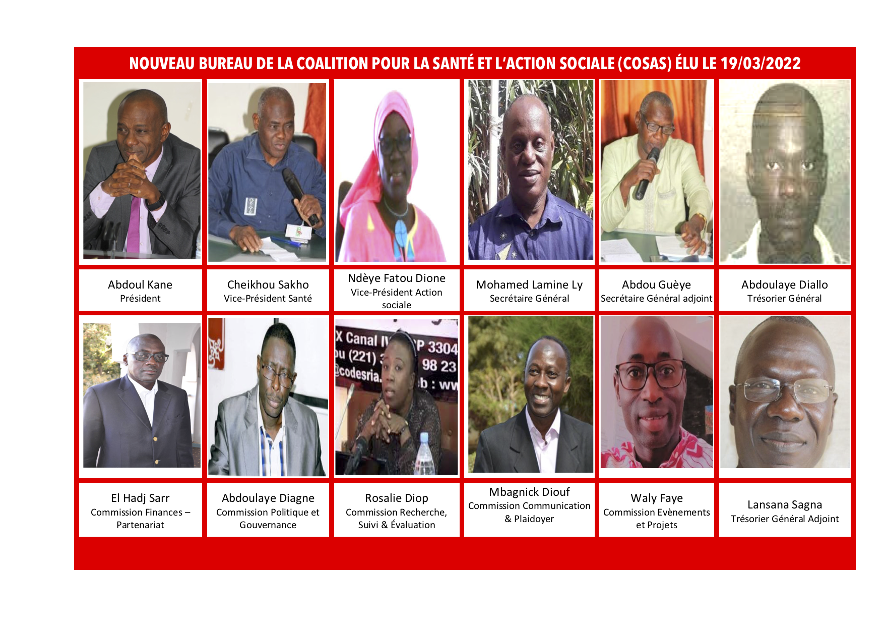 Le bureau de la Coalition pour la Santé et l’Action sociale s’est réuni le dimanche 24 avril 2022 et a examiné, entre autres points, la crise sans précédent, provoquée par le décès inopiné d’une femme enceinte hospitalisée à la maternité de l’hôpital Amadou Sakhir Mbaye de Louga, le 31 mars 2022. La COSAS présente ses condoléances à la famille éplorée et prie pour le repos de l’âme de la défunte au Paradis.