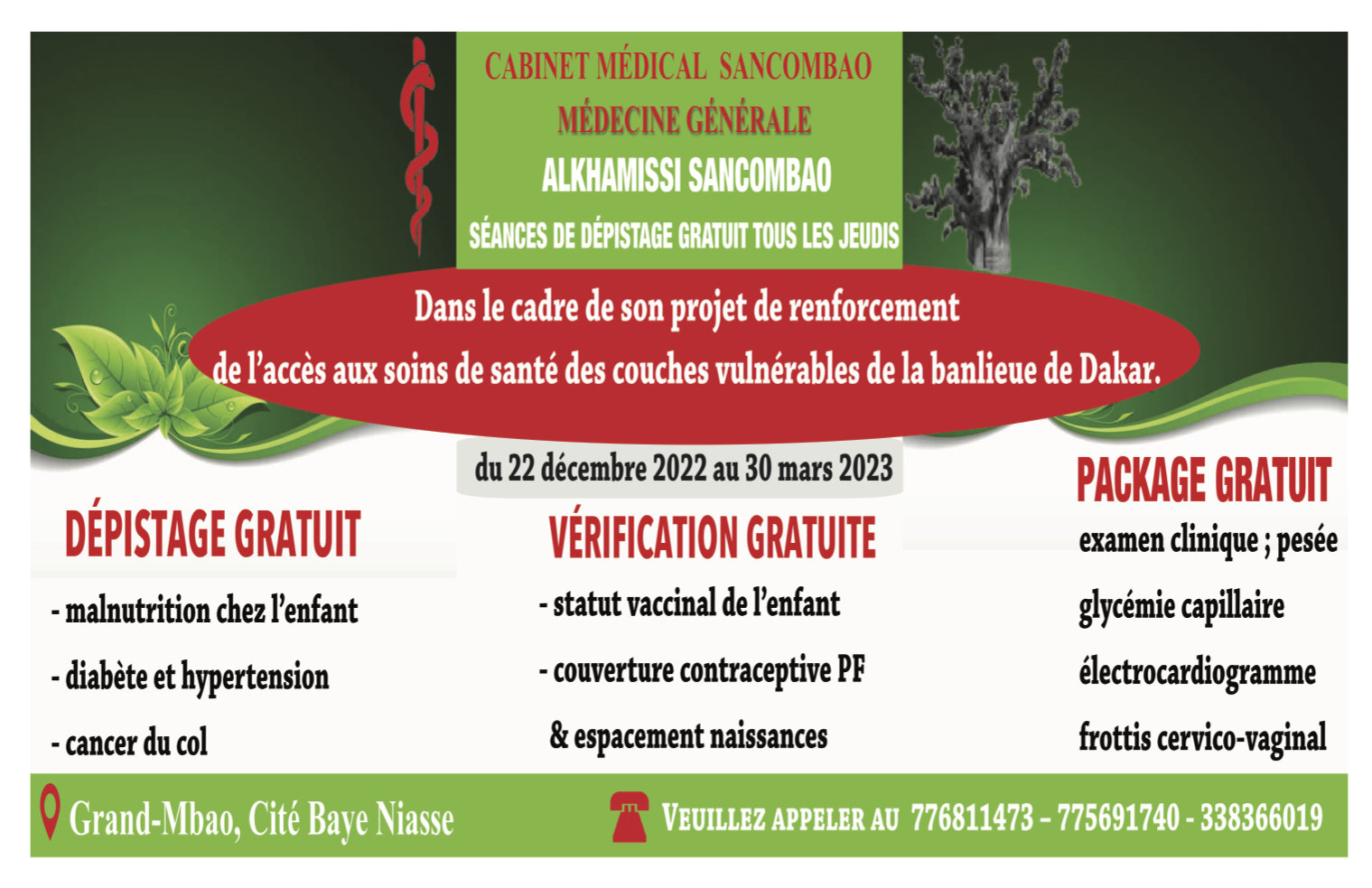 Dans le cadre de son projet de renforcement de l’accès aux soins de santé des couches vulnérables de la banlieue de Dakar, l’équipe du projet va initier une phase pilote dénommée « Alxamissi Sancombao » (les jeudis de Sancombao). Elle va se dérouler, tous les jeudis, du 22 décembre 2022 au 30 mars 2023.